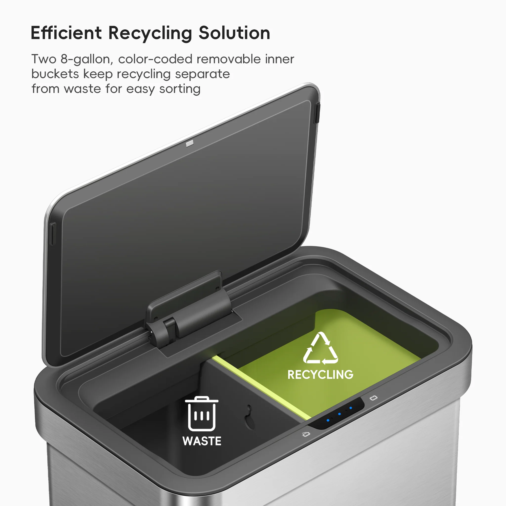- [2 COLOR-CODED INNER BUCKETS WITH HANDLES] Two 8-gallon durable plastic inner buckets lift out easily with the built-in carry handles for quick bag changes and spill cleanups. The color-coded design makes it easy to sort waste and recycling, keeping this dual compartment trash can simple to maintain for everyday kitchen use.