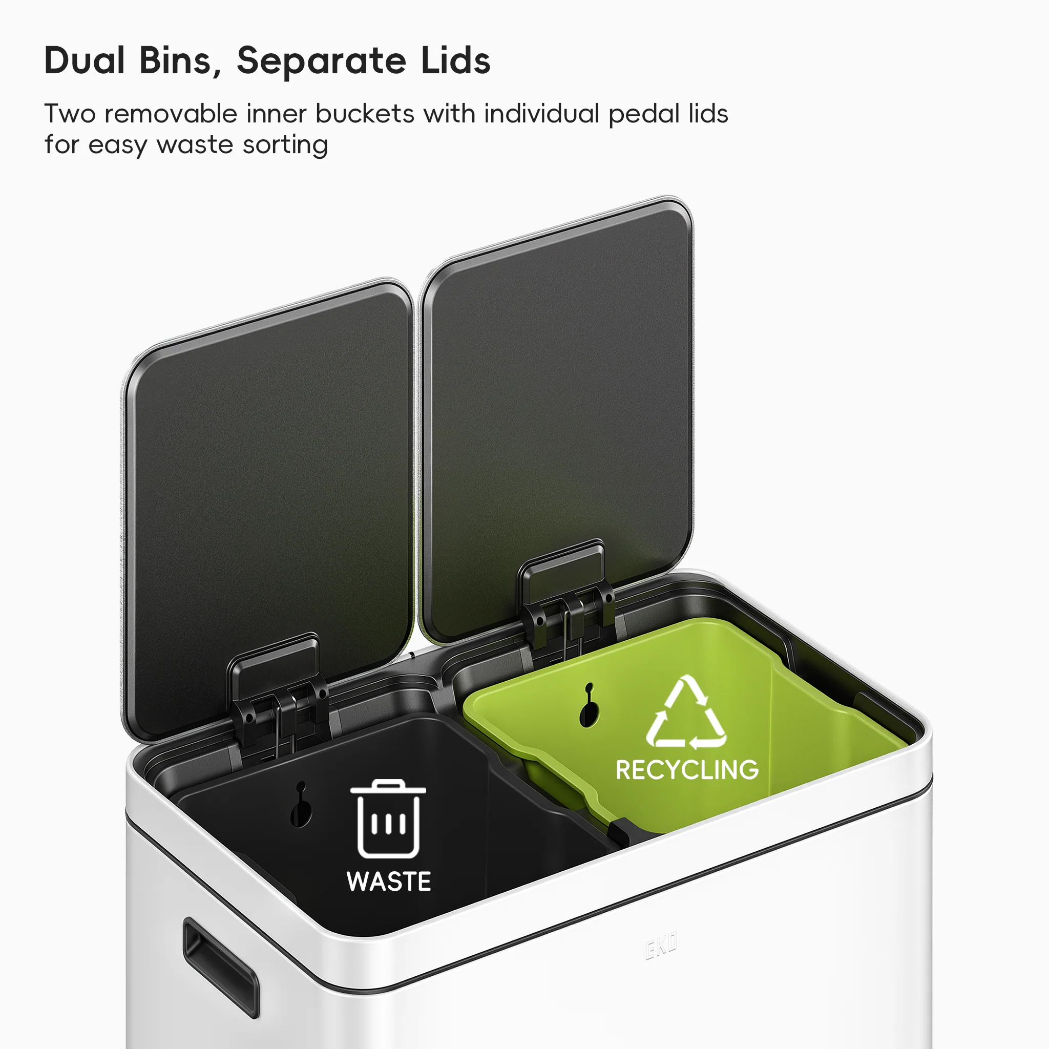 - DUAL PEDAL RECYCLER - Effortlessly sort trash and recyclables with dual colored inner bins in 8 Gallons each, EKO double trash can features distinct pedals and lids for no-fuss disposal.
