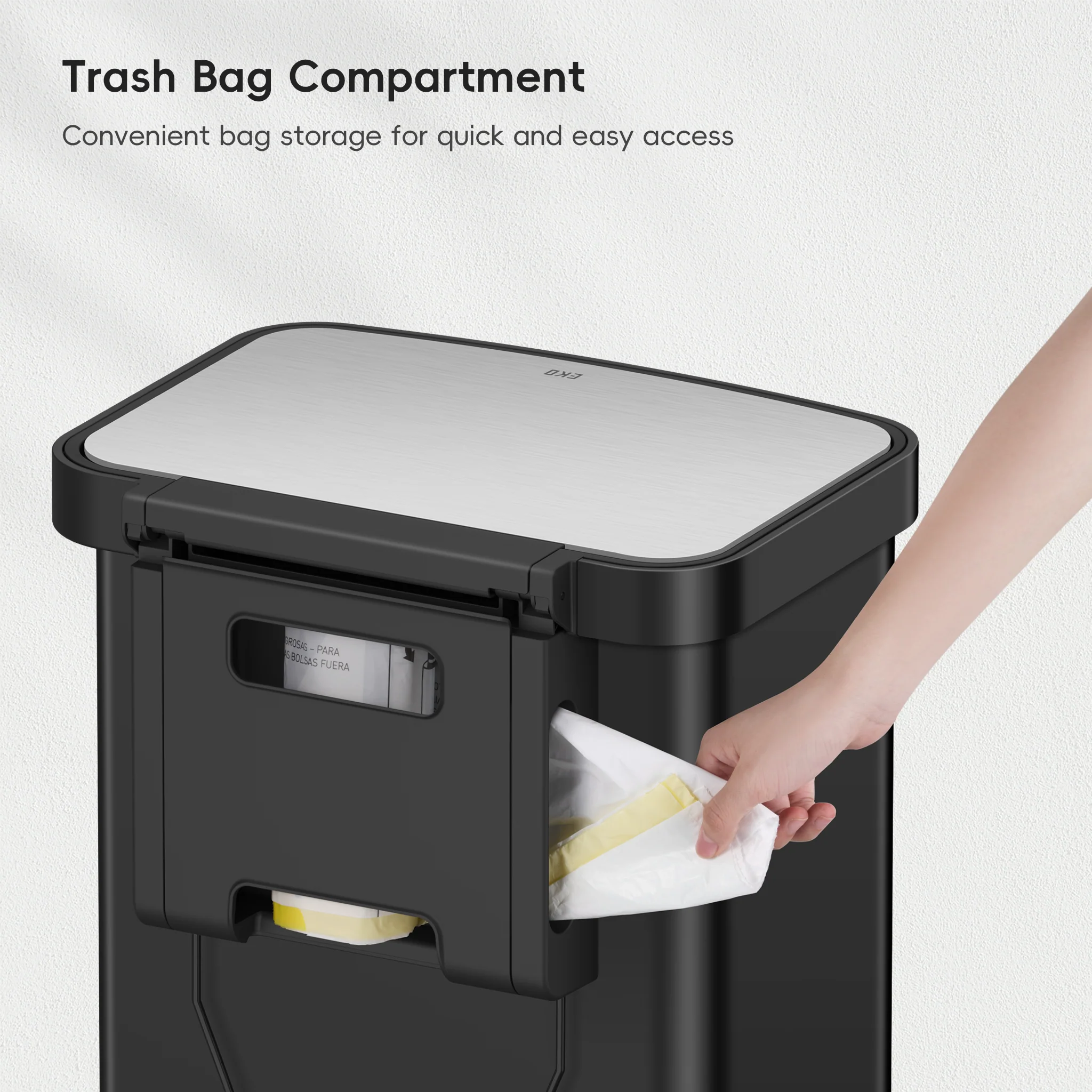 - Tidy Bag Storage, Ready to Roll - No more bag clutter! This kitchen trash can has a special designed compartment on the back to stash extra 13-gallon trash bags. When it's time for a change, simply grab one from the side and roll with ease